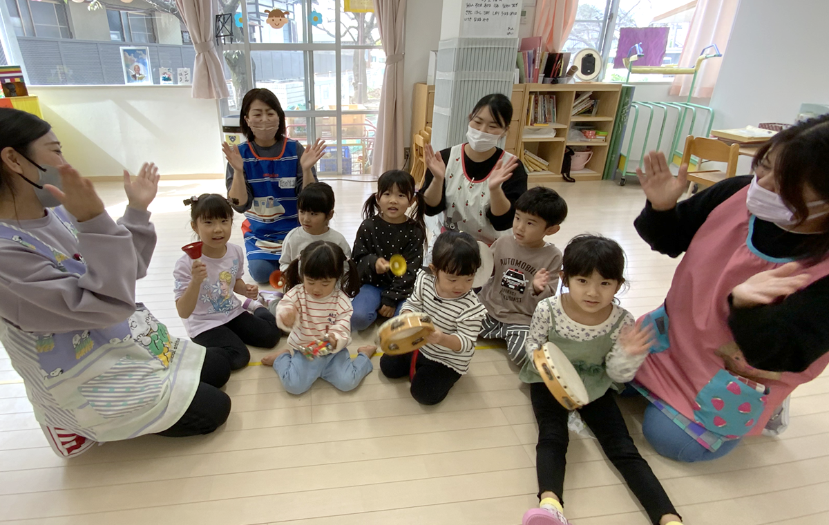 歌ったり、踊ったり、身体で表現したり子ども達の笑顔が溢れます!年齢に合ったリズム遊びを、0歳児からおこないます。合奏や合唱、お母さんの背中で聞いた「子守歌」私たち日本人が失いかけている家族と一緒に歌った「こころに残る歌」・・・ずっと忘れずにいたいものです。